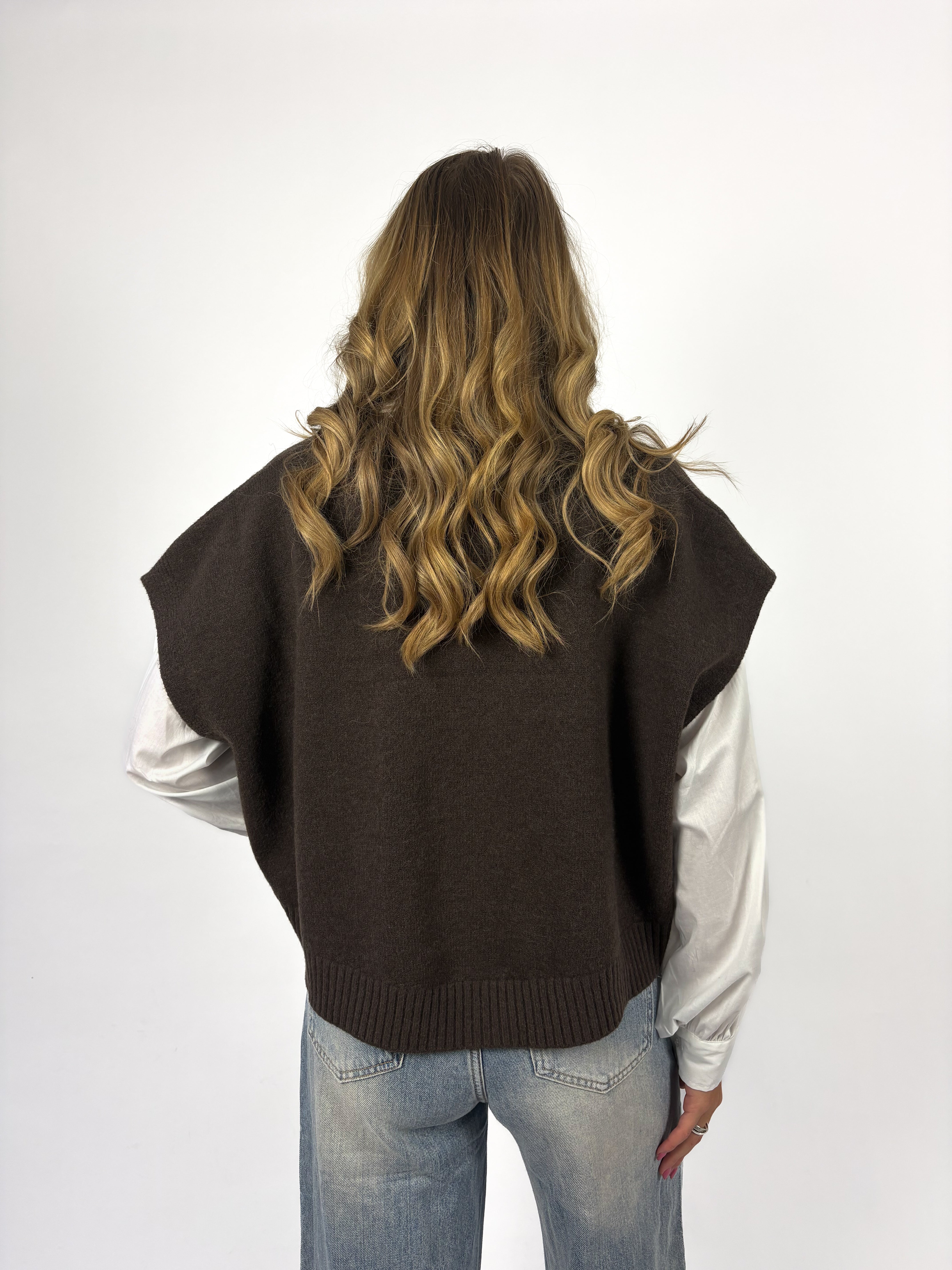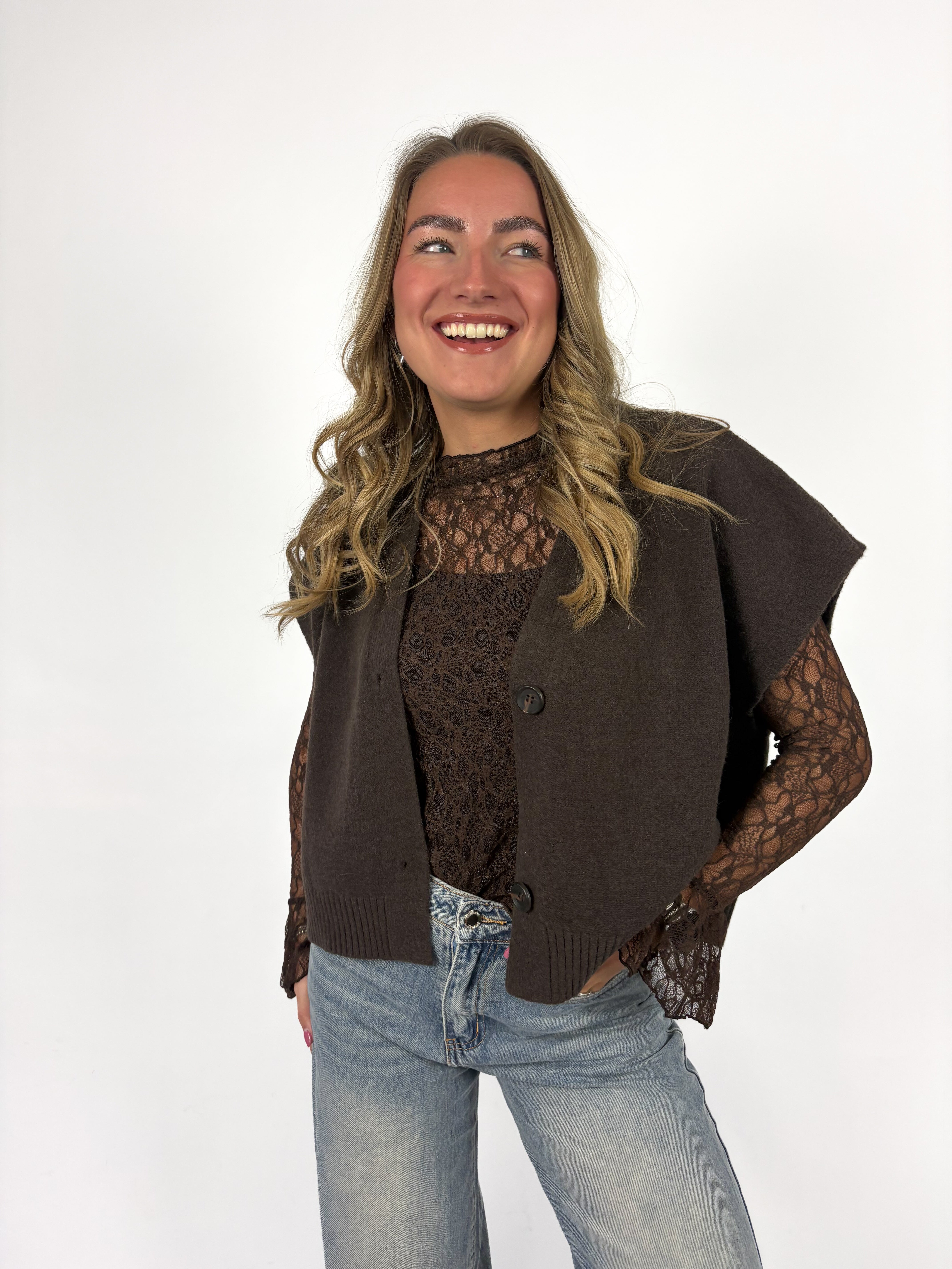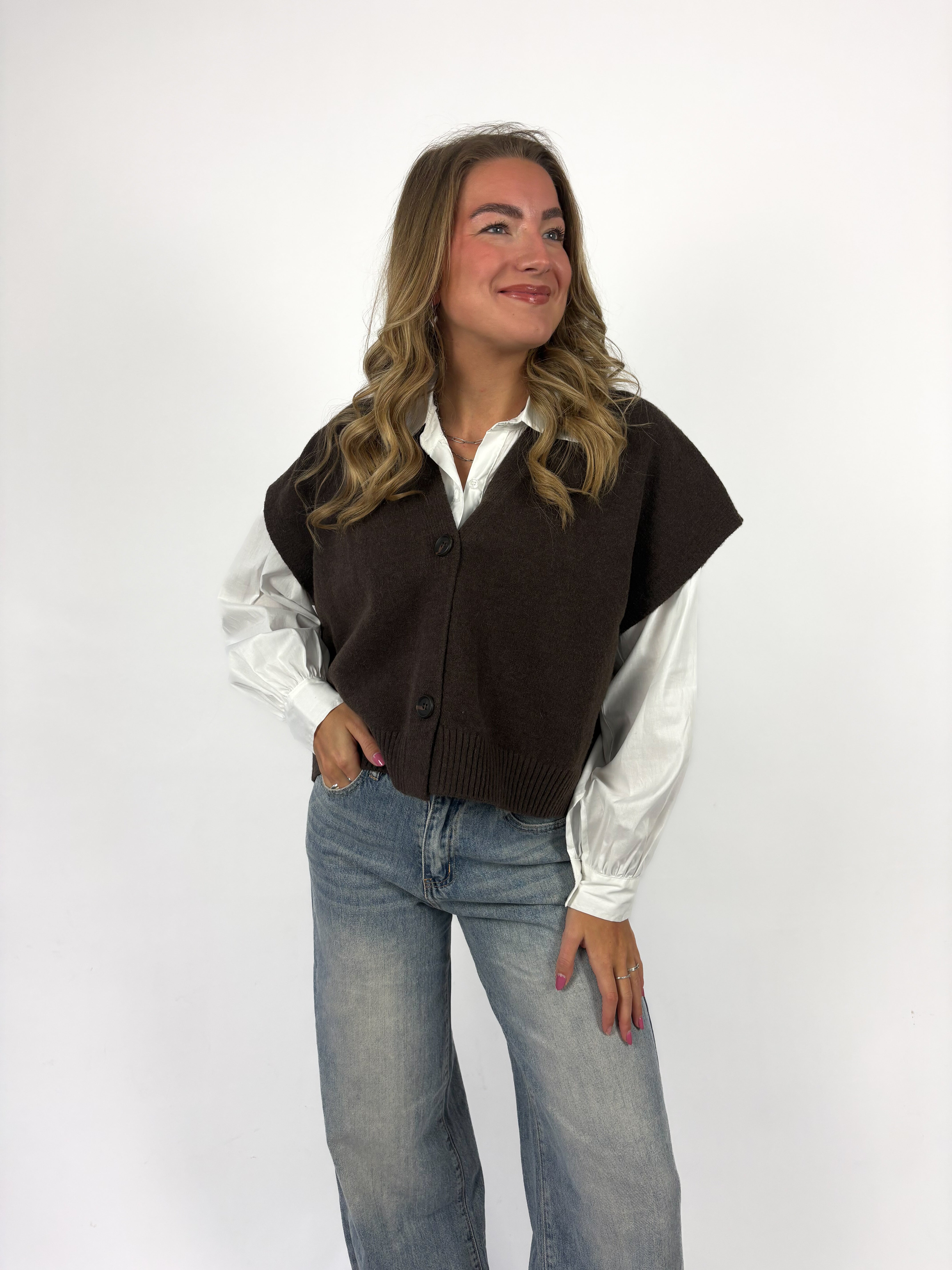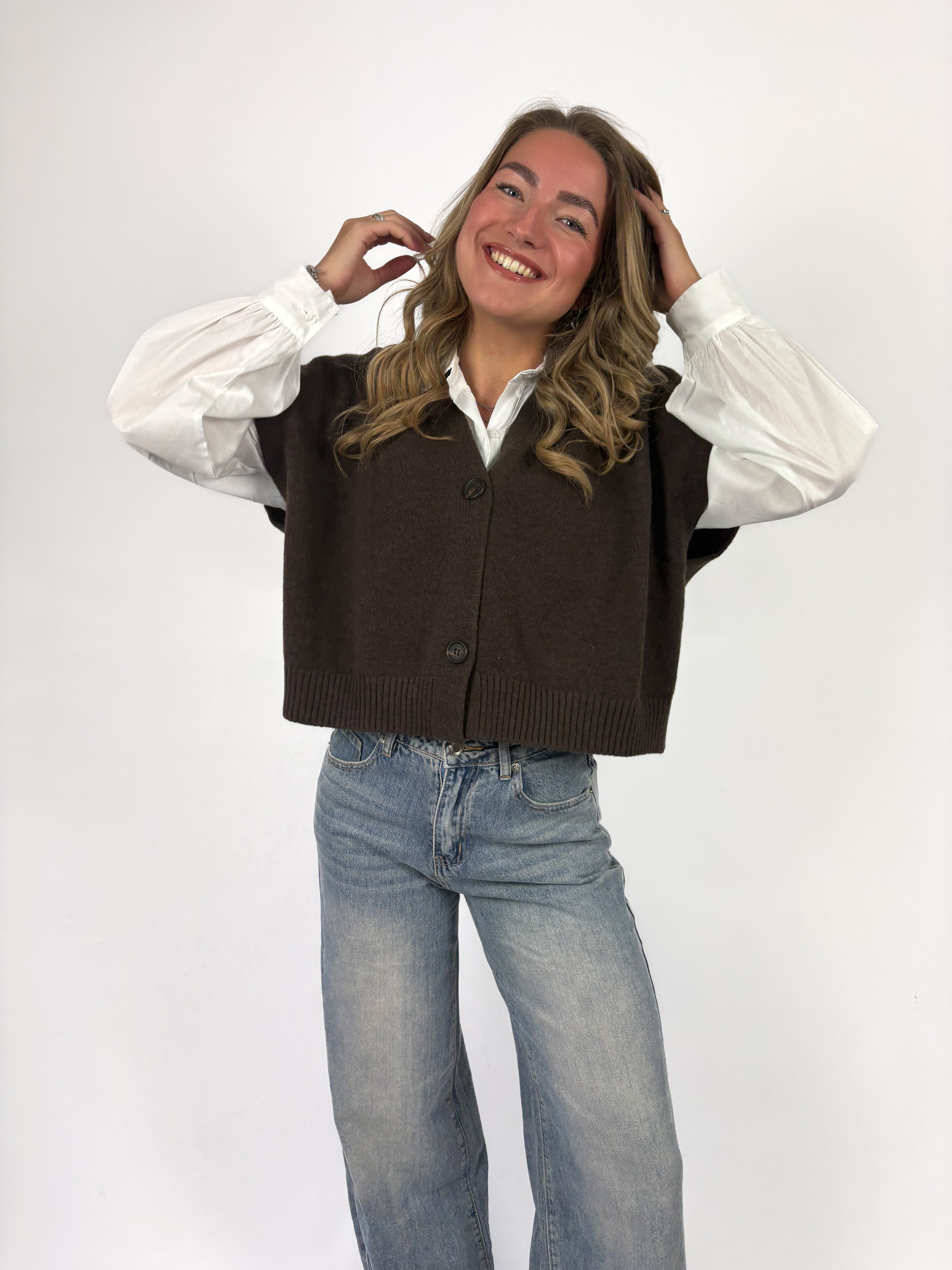Deze bruine spencer met knoopjes is zo’n item dat je eindeloos kunt combineren 🤎